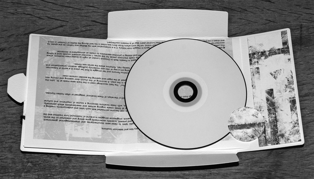 Hand-finished white/black CD album in textured recycled fold-out sleeve with fold-out text insert, print, sticker and badge.